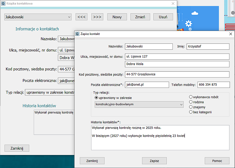 Książka kontaktów ułatwia przechowywanie danych osób, z którymi łączą nas relacje, pozwala usystematyzować prowadzone z nimi kontakty. Książka jest przeznaczona głównie do nadzorowania łączności z osobami uprawnionymi do kontroli budynków jednorodzinnych i wykonawcami usług. Można w niej także wpisywać dane o kontaktach z osobami o innym profilu. W procesie kontroli obiektów budowlanych uczestniczy czasami dosyć pokaźna grupa ludzi, warto więc zadbać o to, żeby kontakty z nimi były uporządkowane. Uruchamiamy Książkę kontaktów, wybierając z okna Narzędzia komendę o tej samej nazwie. Pojawia się kolejne okno, w którym zebrane są dane osób - te dane, które wcześniej zapisywaliśmy. Możemy przeglądać informacje i dopisywać dane z nowych kontaktów z nimi, możemy wprowadzać nowe osoby. Jeśli na przykład uległ zmianie numer telefon lub adres zamieszkania, modyfikujemy wcześniejszy wpis. Jeśli wiemy na pewno, że nie będziemy się już kontaktować z określoną osobą, usuwamy informacje jej dotyczące. ![]() Wprowadzenie nowej osoby jest bardzo łatwe - wybieramy w tym celu przycisk Nowy. W kolejnym okienku, które się pojawi, dokonujemy zapisu. Dodatkowe informacje oraz relacje z kolejnych kontaktów można dopisywać do pola tekstowego w dole okienka. Po wykonaniu wpisu przechodzimy z powrotem do pierwszego okna po wybraniu przycisku Zapisz, jednocześnie akceptując wpisane informacje, które będą zachowane. Nowy kontakt zostanie dopisany do bazy, a nazwisko jest już widoczne w liście rozwijalnej, w porządku alfabetycznym. Poszczególne osoby łatwo odszukać: wybieramy w tym celu nazwisko z listy rozwijalnej. Po naciśnięciu na wybrane nazwisko będą widoczne informacje dotyczące tej osoby: decydujemy, czy kontaktować się z nią korzystając z podanych numerów środków łączności, czy zmienić zapis, czy go usunąć. Dostęp do poszczególnych funkcji Książki kontaktów jest możliwy po najechaniu myszką na przycisk lub po zastosowaniu skrótów z klawiatury: Ctrl + N - dla „Nowy", Ctrl + I - dla „Zmień", Ctrl + U - dla „Usuń", Ctrl + S - dla „Zapisz" (w drugim okienku), > - dla przeglądania adresów w kierunku prawym (w dół listy), < - dla przeglądania w kierunku przeciwnym do poprzedniego, i oczywiście Ctrl + M - dla „Pomoc", ESC- dla „Zamknij". |