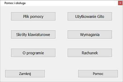 W okienku „Pomoc i obsługa" można wykonać polecenia związane z obsługą programu GITO.![]() Pierwszym przyciskiem otwiera się plik pomocy ten, który właśnie Państwo czytają. Drugi przycisk „Skróty klawiaturowe" pokaże dokument PDF, w którym jest zestawienie wszystkich kombinacji klawiszy, ze wszystkich okien, użytych w programie GITO do uruchamiania komend. „O programie" przywołuje okno, w którym umożliwi kontakt z autorem programu, otwarcie portalu właścicieli budynków jednorodzinnych, zapoznanie się z umową licencyjną. „Użytkowanie Gito" otwiera hipertekstowy instruktaż, który ułatwia szybkie poznanie programu. Przycisk „Wymagania" pokaże okienko, w którym podane są wymagania sprzętowy dla programu GITO. W pliku pomocy powtórzono, jakie minimalne właściwości systemu komputerowego są niezbędne do uruchomienia programu GITO. Wybór polecenia „Rachunek", jak wskazuje nazwa, spowoduje wydruk dokumentu potwierdzającego zakup licencji programu GITO Podczas pracy w okienku „Pomoc i obsługa" są dostępne skróty klawiaturowe: Ctrl + odpowiednia litera. Oto wykaz skrótów dla tego okna: Ctrl + P - dla „Plik pomocy", Ctrl + K - dla „Skróty klawiaturowe", Ctrl + O - dla „O programie", Ctrl + U - dla „Użytkowanie Gito", Ctrl + W - dla „Wymagania", Ctrl + R - dla „Rachunek", i oczywiście te same skróty, jak w innych oknach: Ctrl + M - dla „Pomoc", ESC - dla „Zamknij". . |