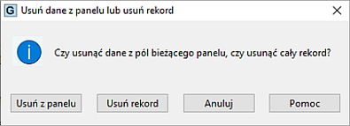 Usunięcie tekstu wpisanego do pól i ustawienie przycisków opcji w bieżącym panelu okna „Zalecenia i roboty do wykonania" nastąpi po wybraniu przycisku „Usuń z panelu", można posłużyć się skrótem z klawiatury - Ctrl + P. Rekord z bazy, z wszystkimi danymi pokontrolnymi, zostanie usunięty po naciśnięciu na przycisk „Usuń rekord", skrót - Ctrl + R. Skrót dla polecenia „Anuluj" - Ctrl + A, dla „Pomoc" - Ctrl + M.![]() |